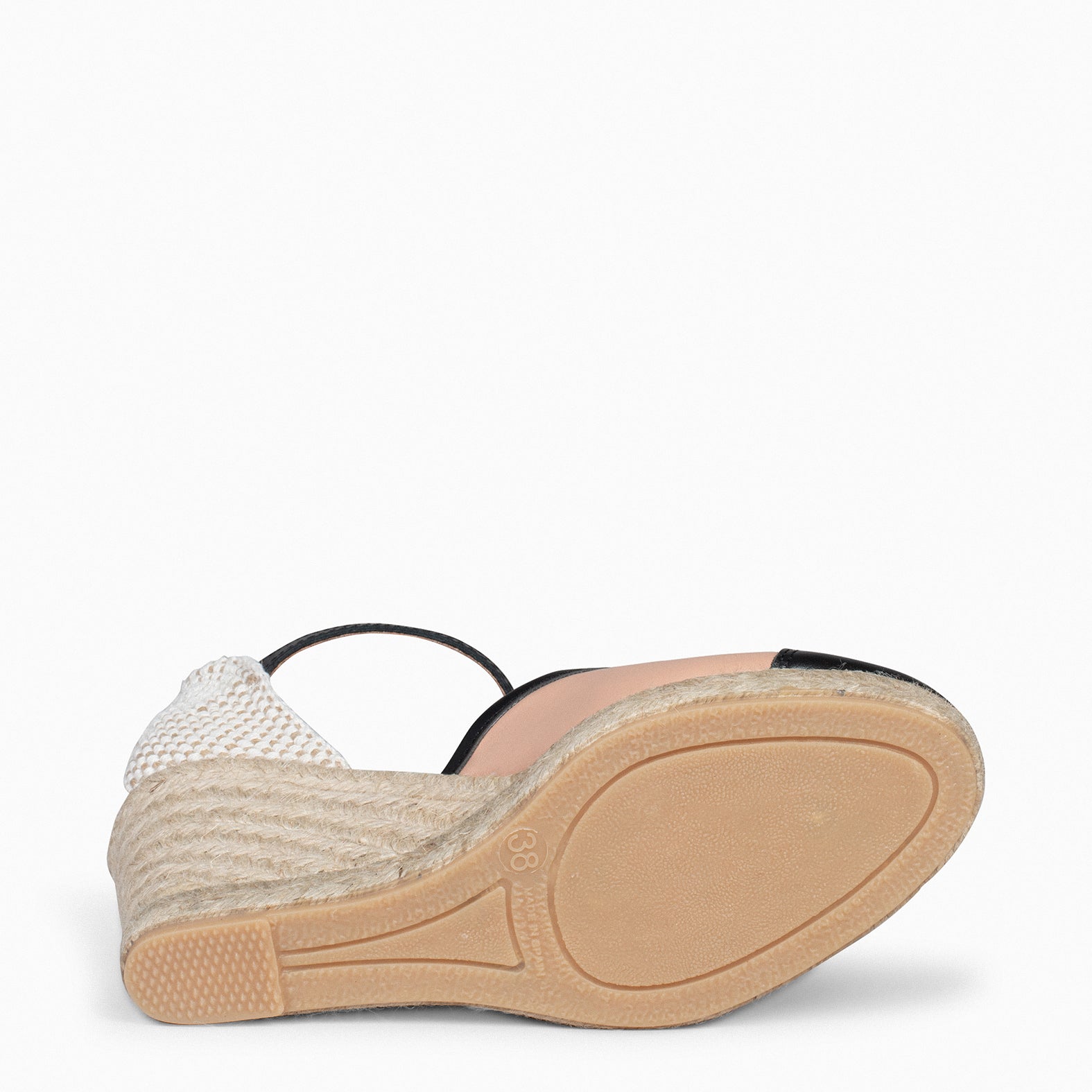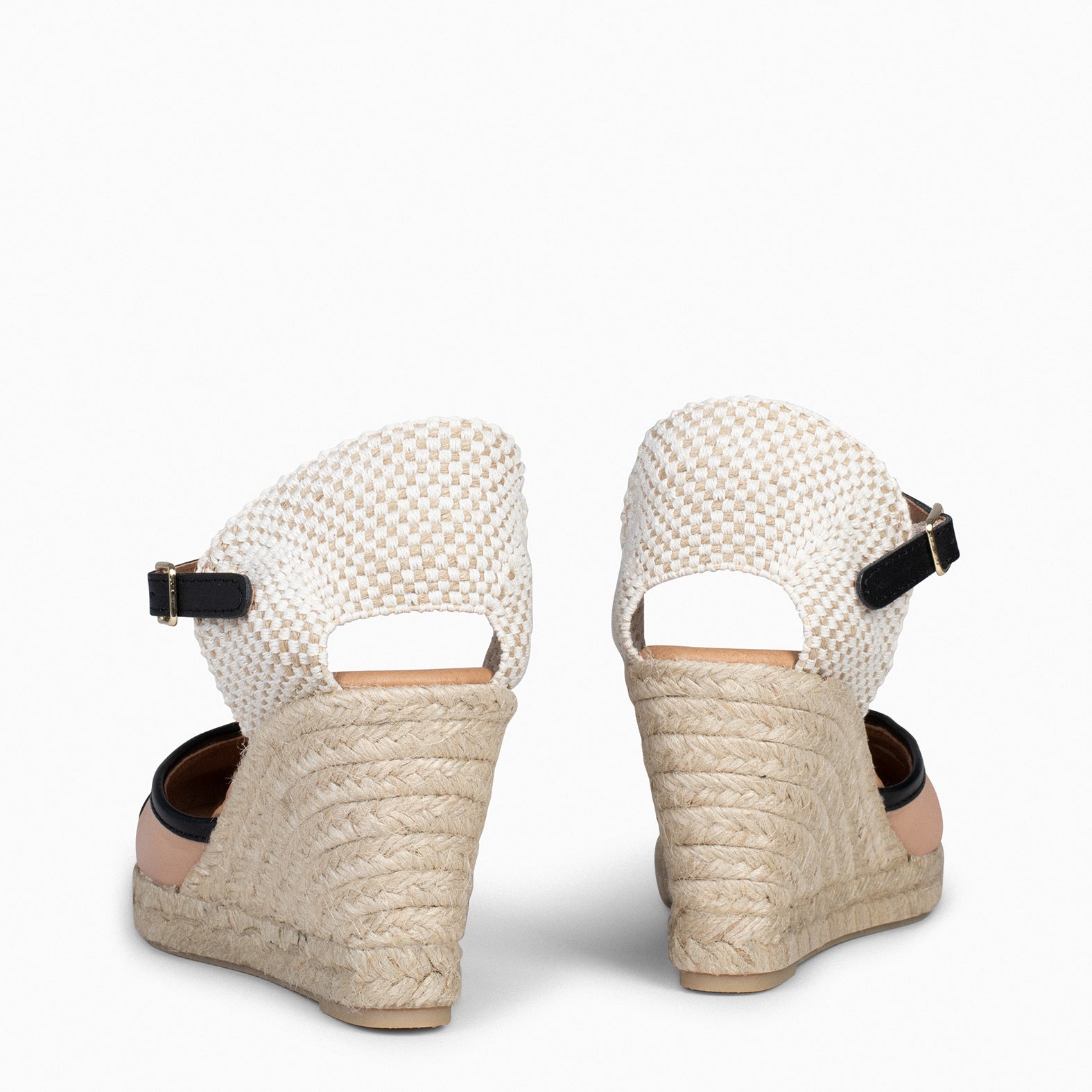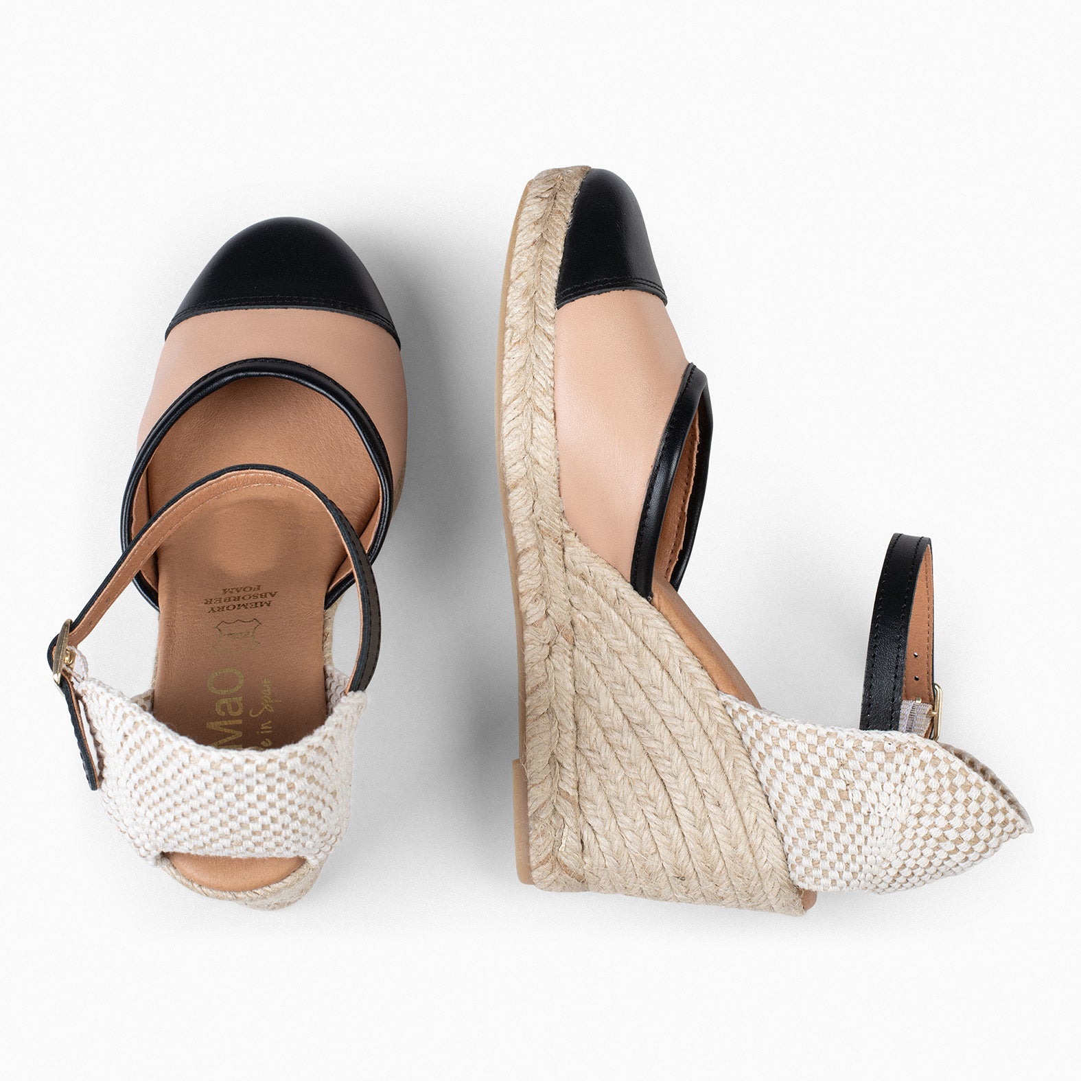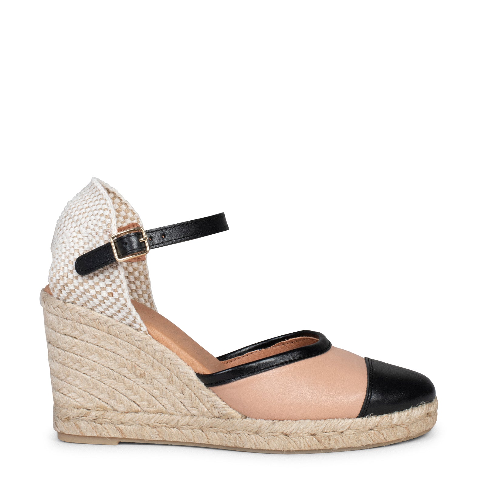 The perfect espadrilles for Spring Summer 2024. You will love our VALENCIANA espadrilles with its combination of neutral materials, it will match all of your outfits. The round toe is made of black nappa leather, and the rest of the espadrille is made of neutral nappa leather. This style features our Ultra Comfort Gel insole with drop of gel becoming your most comfortable wedges. 100% leather, Made in Spain espadrille, comfort meets technology.