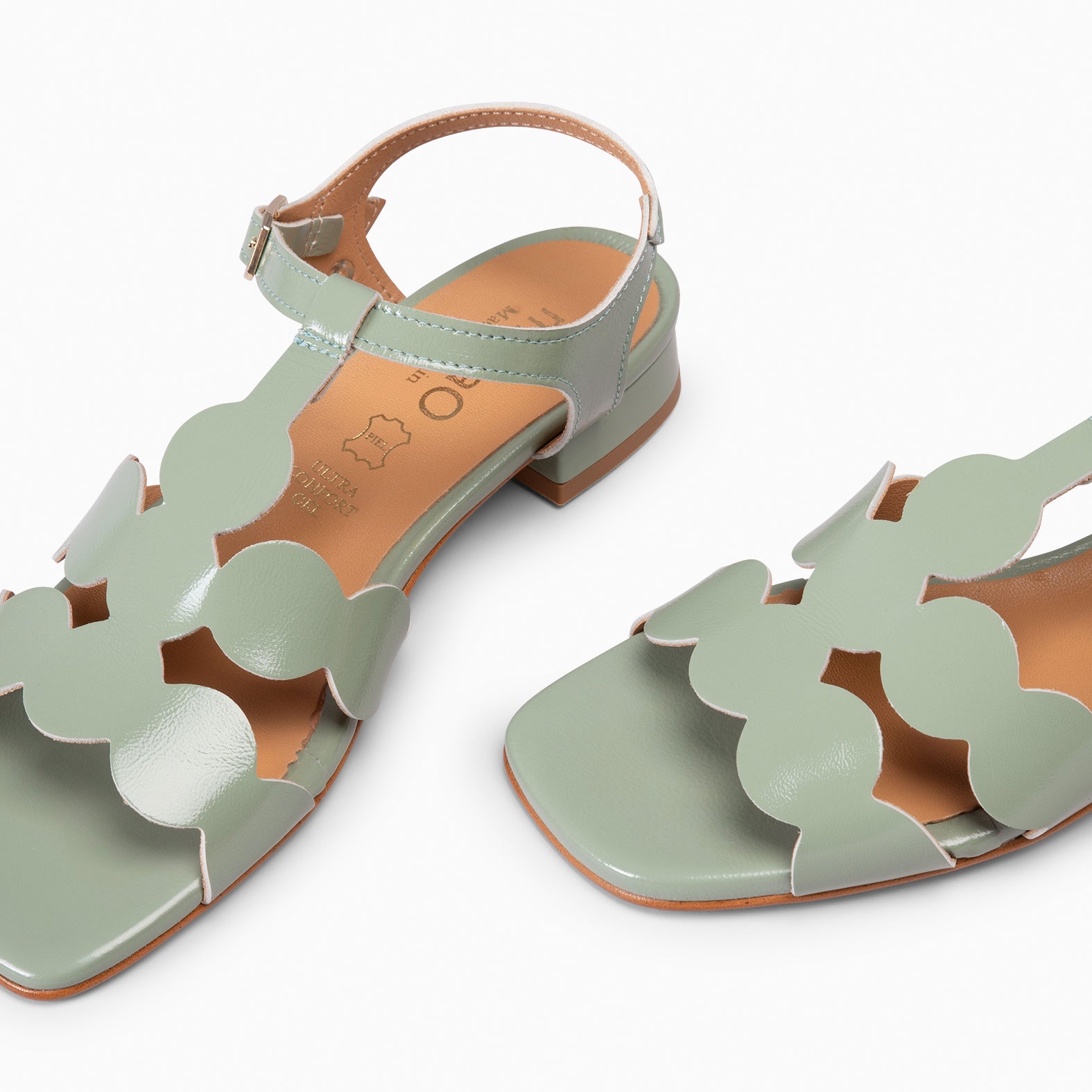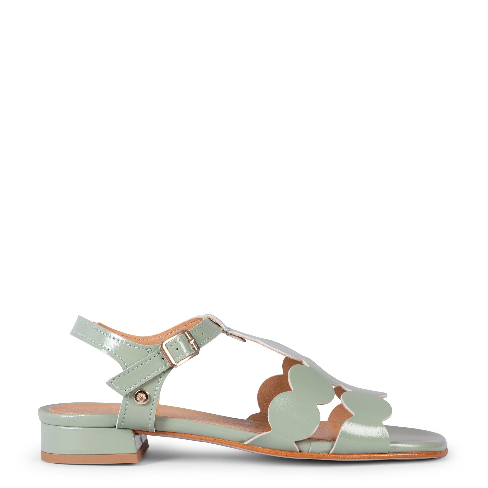 This elegant low-heeled sandal has a height of 2.5 cm high; the outer material of the shoe is patent leather. It has a decorative shape on the instep that makes it a distinctive touch to the other sandals.