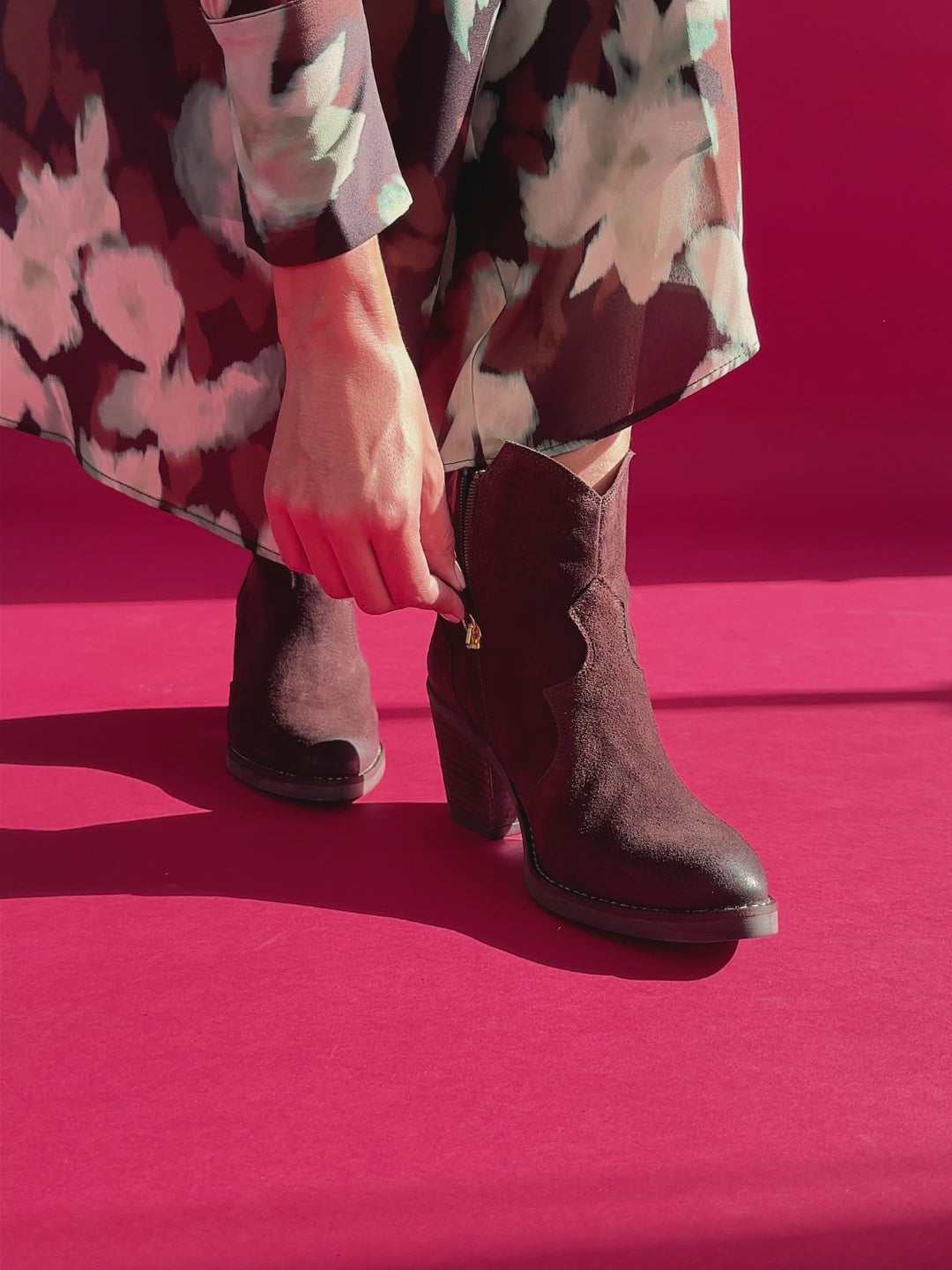 Our new cowboy boot is made suede leather. It features a heel height of 7.5 cm and includes the logo stud miMaO on the side.