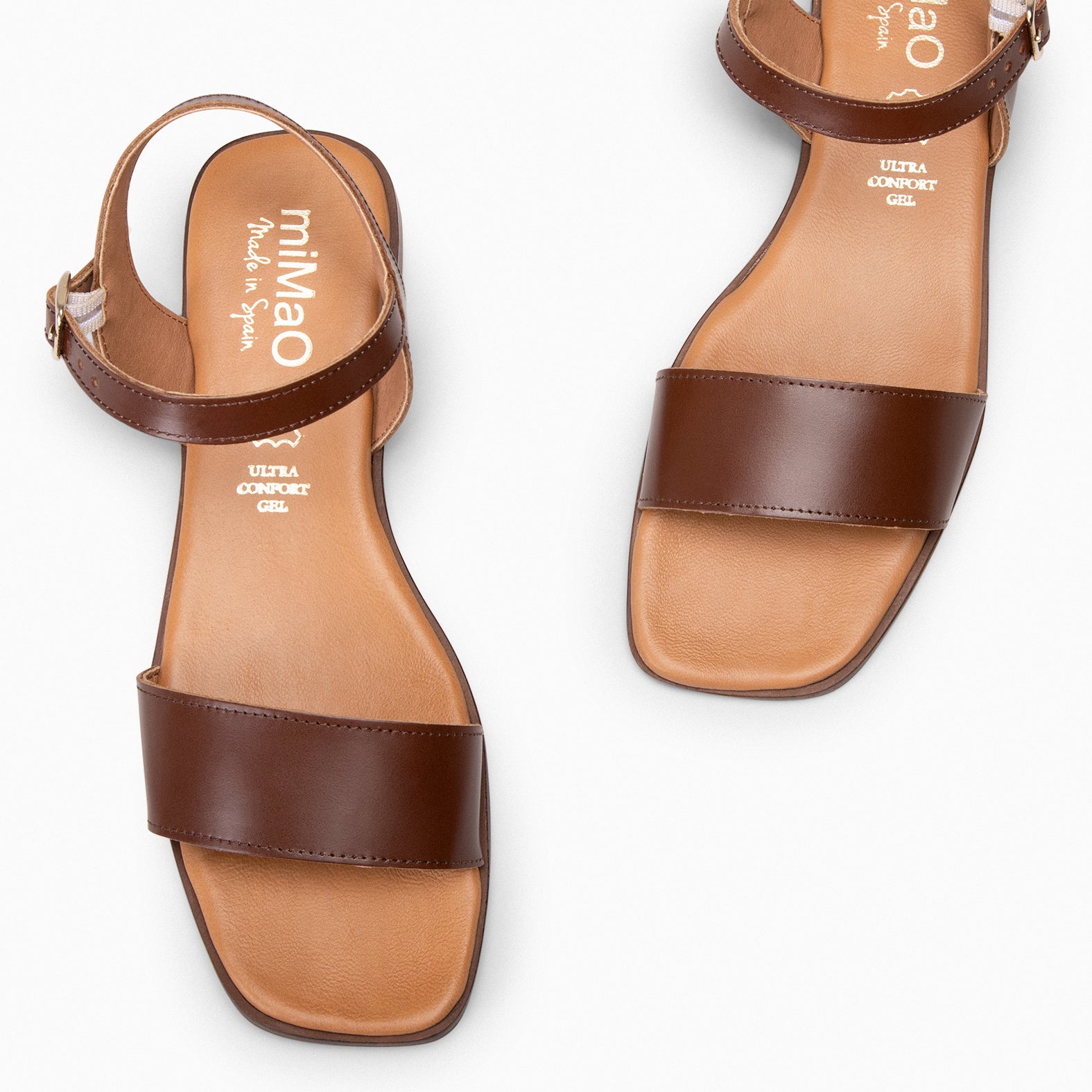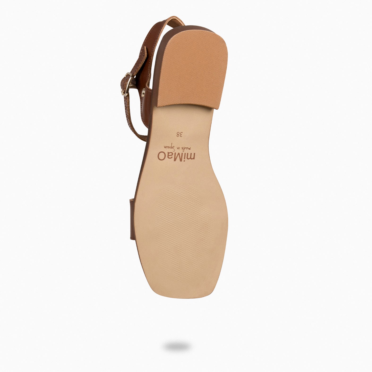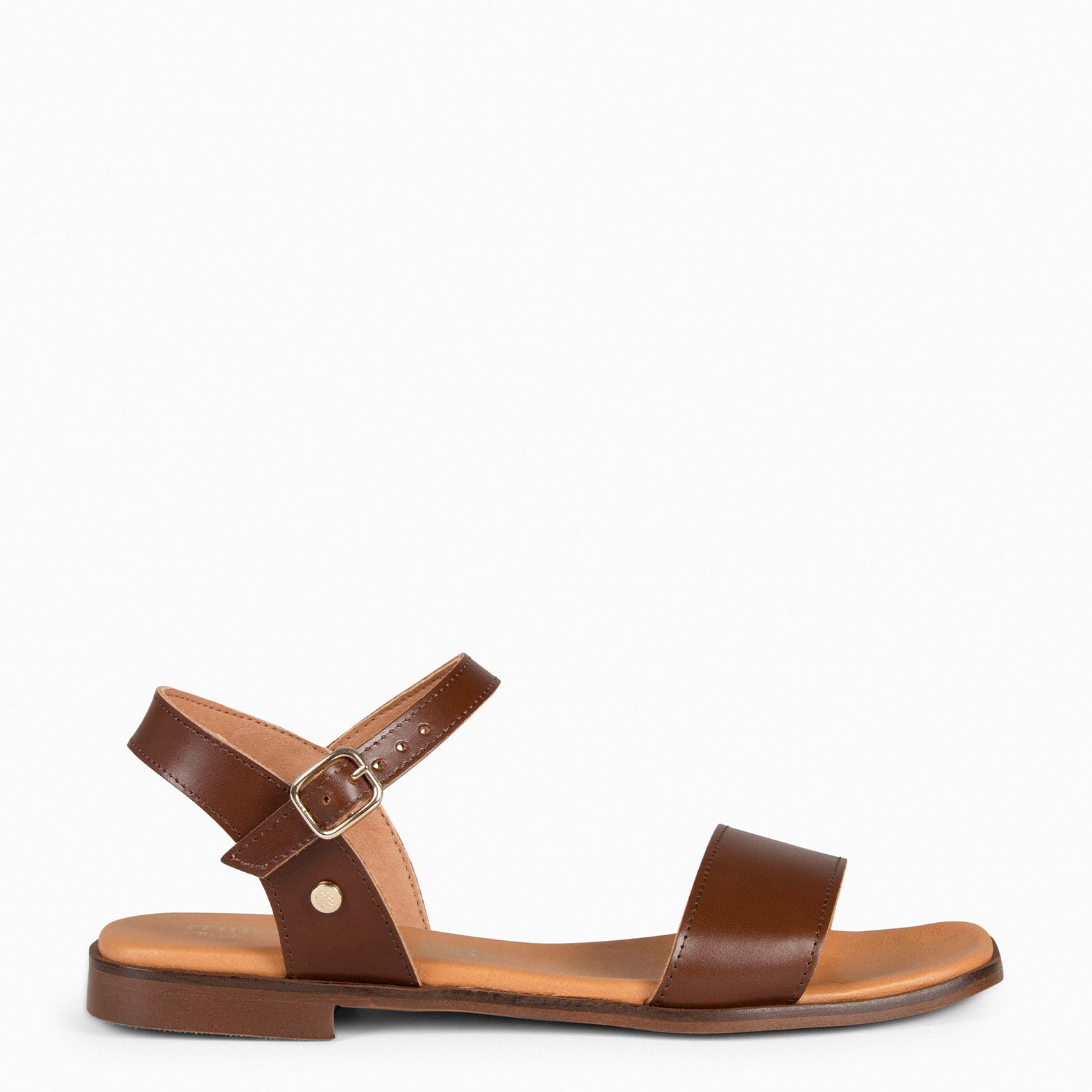 Sandalias planas de mujer de diseño sencillo que te acompañará en tu día a día. Están fabricadas en piel de color Camel.