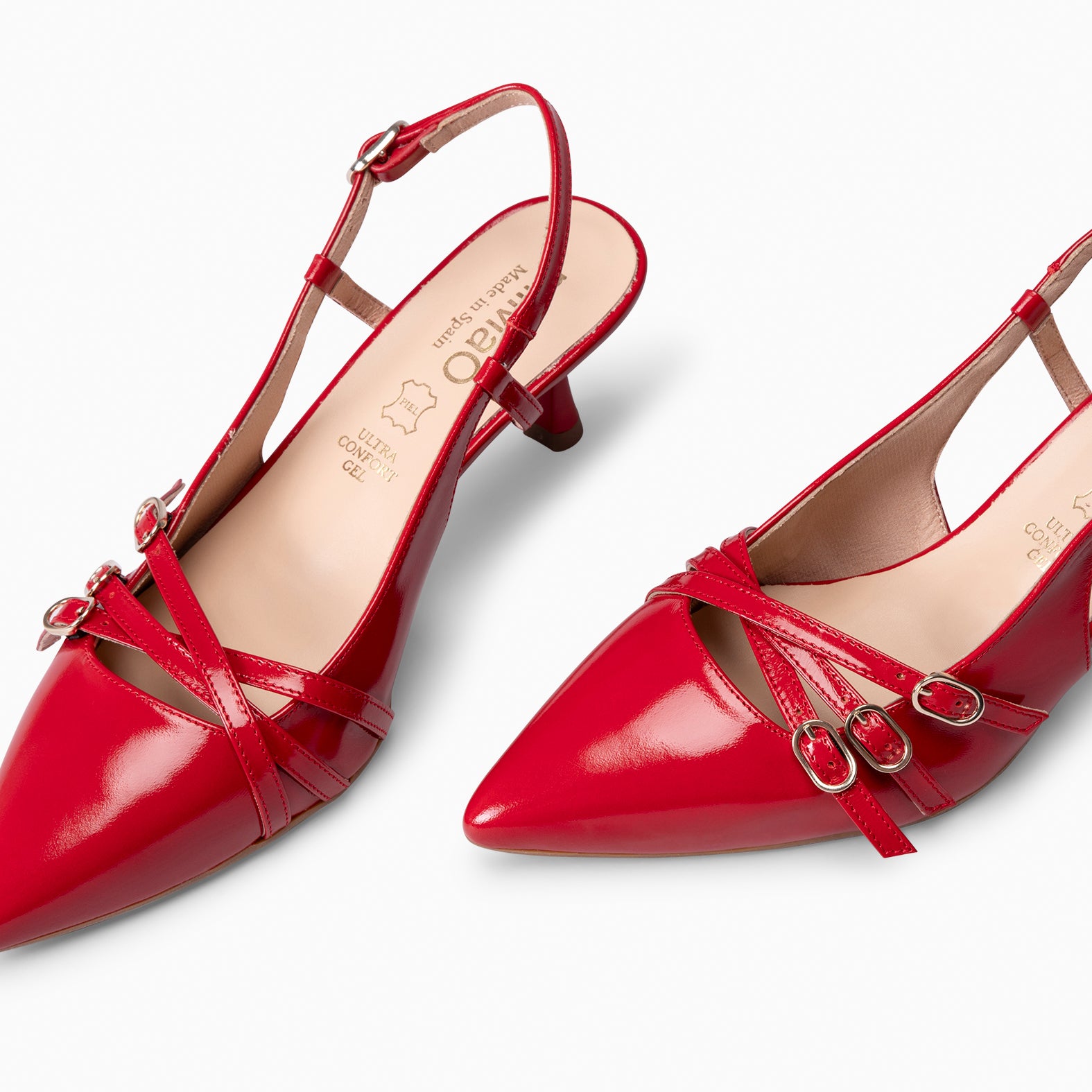 Los zapatos de tacón bajo destalonados tienen un tacón de 6 cm y están hechos en piel de charol. Presentan un elegante acabado en V, con hebillas decorativas en el empeine, y una hebilla trasera ajustable para un ajuste más cómodo y seguro.