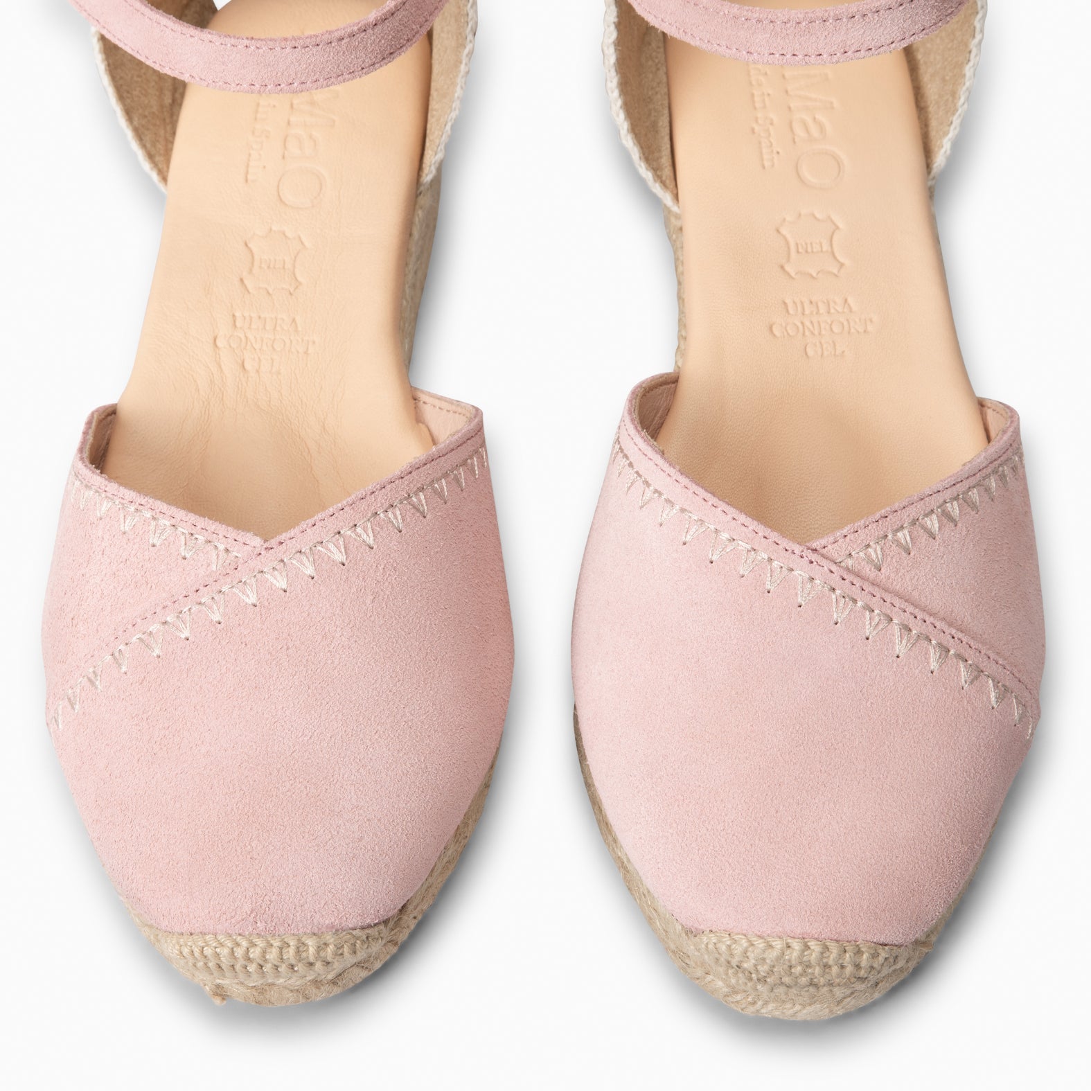 La cuña de esparto cuenta con una altura de 5cm de altura y una plataforma de 1.5cm, y el material exterior de la cuña es de serraje. Presenta una costura en el empeine que aporta a la cuña un estilo único y diferente a las demás.