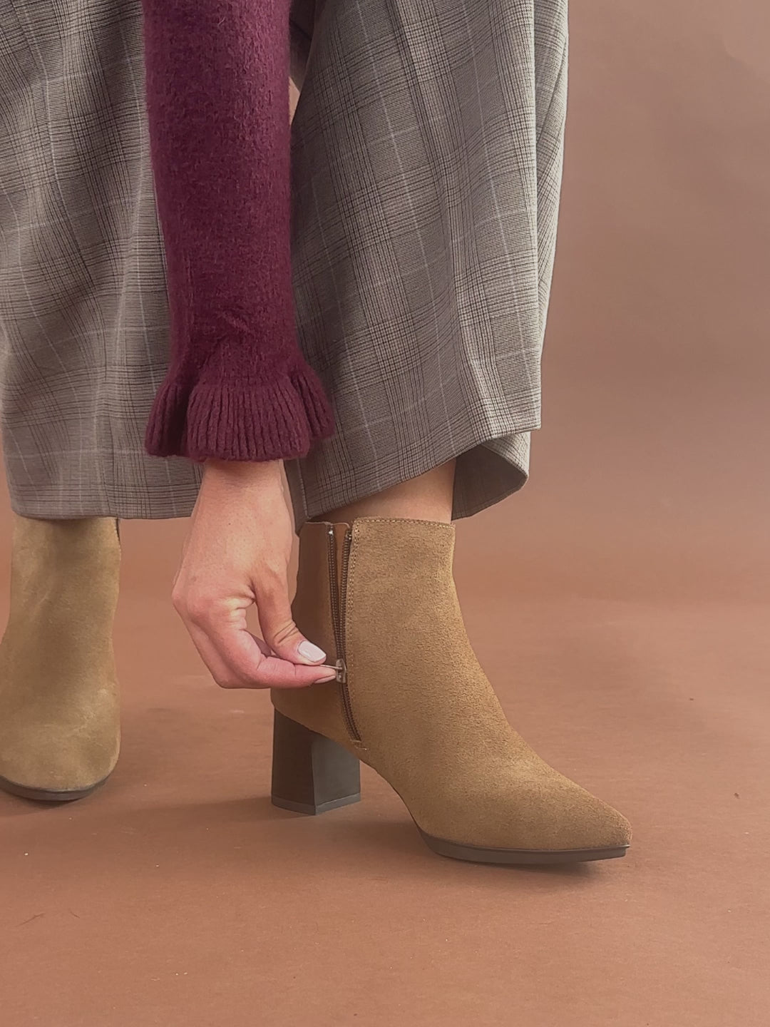 Botines con tacón ancho de la nueva colección. Botines de mujer cómodos y elegantes de piel de serraje y caña media. Estos botines tienen un tacón medio en bloque o ancho que te aportará toda la estabilidad que necesitas para caminar con tacones. El tacón tiene una altura de 6 cm y es imitación a madera.