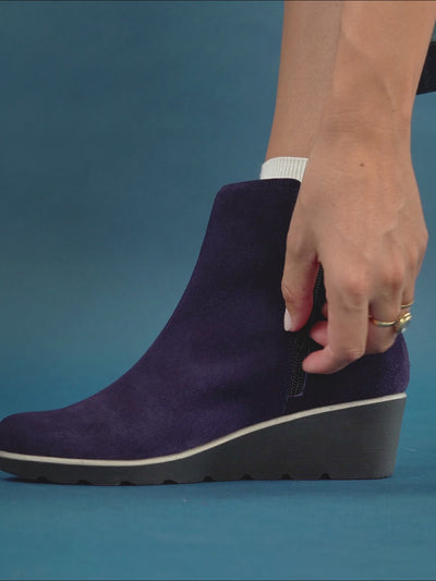 El botín está fabricado en piel de serraje hidrófugo, está piel repele el agua y evita que cale y moje tus pies. Tiene una altura de 5cm y cuenta con una línea en contraste con el tacón y el botín.