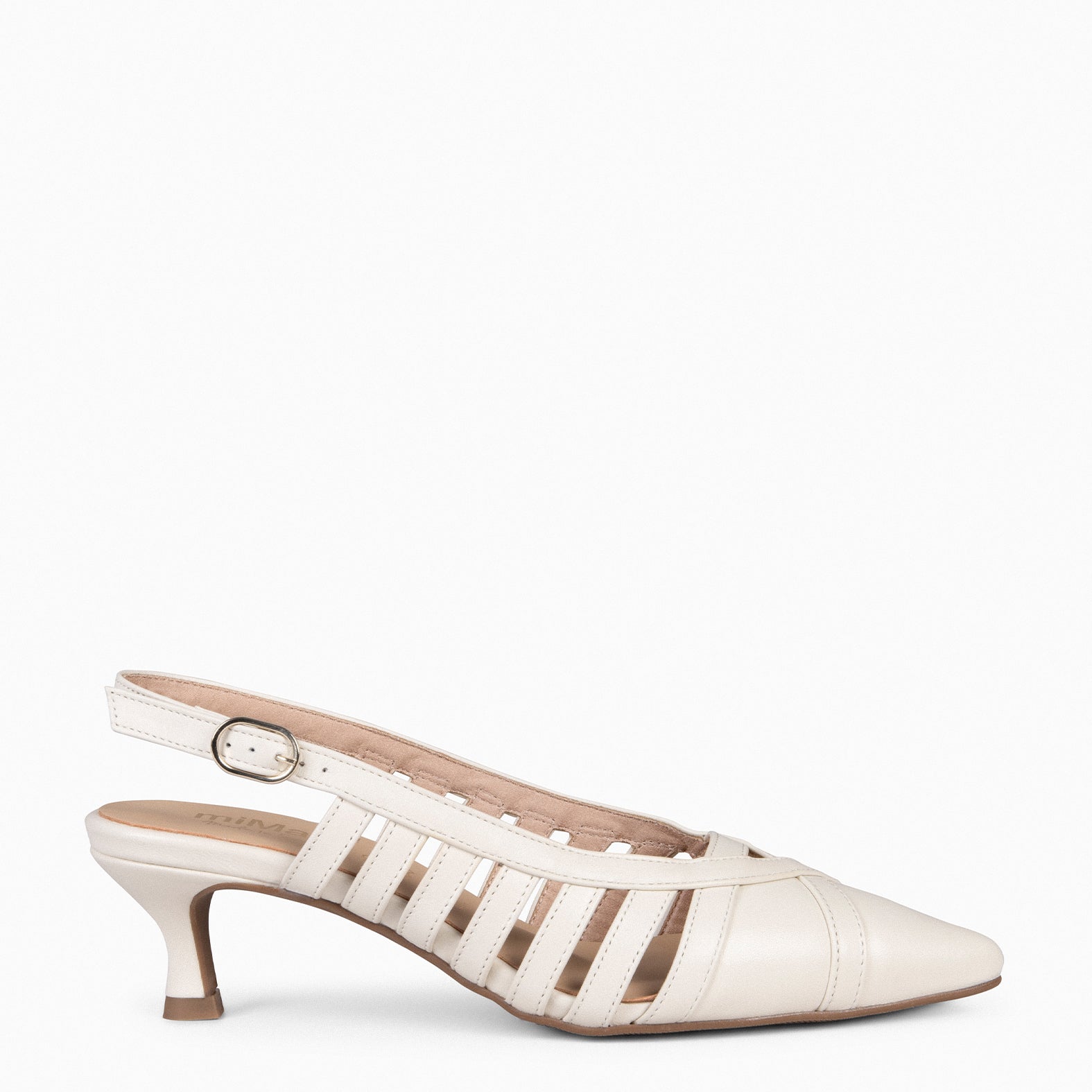 Precioso zapato destalonado para mujer en color Hueso, que presenta un encantador tacón kitten de 5 cm, ideal para añadir un toque de altura.