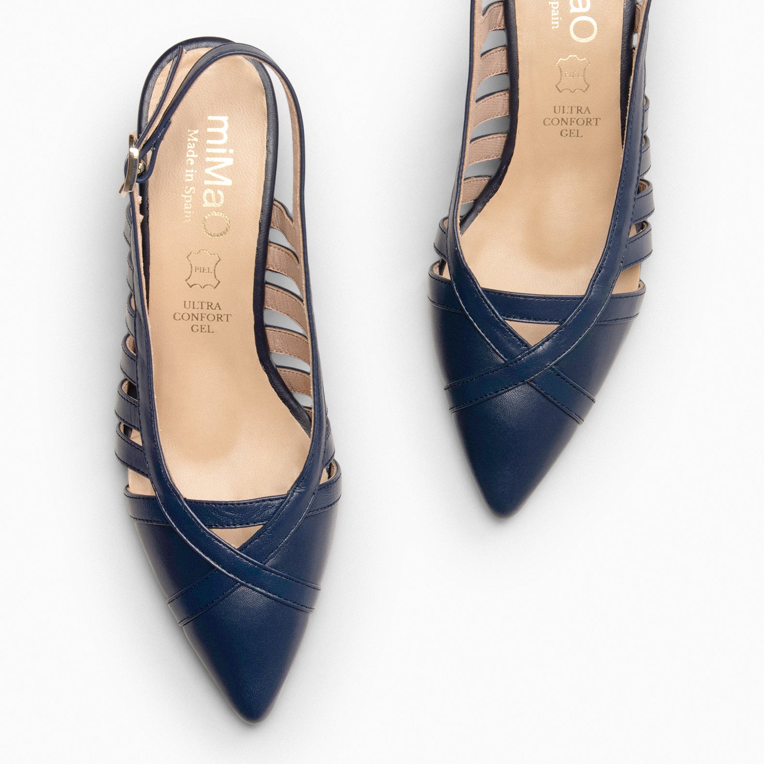 Precioso zapato destalonado para mujer en color Azul Marino, que presenta un encantador tacón kitten de 5 cm, ideal para añadir un toque de altura.