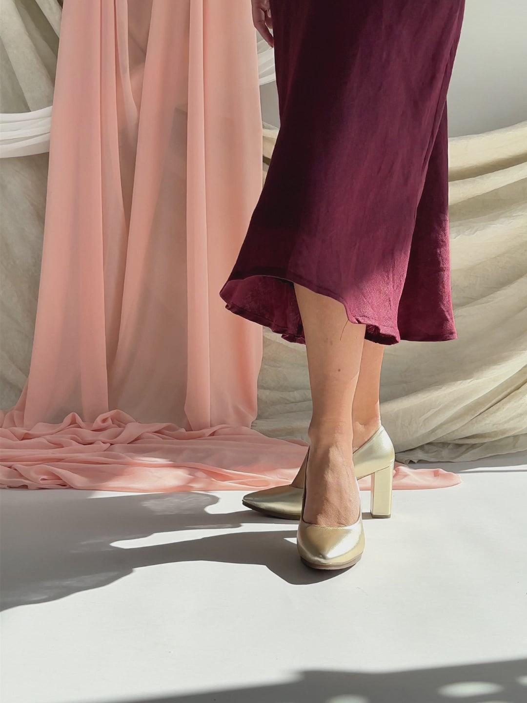 Estos zapatos de tacón con un acabado metalizado perfecto para completar tu armario con una línea de tonos metálicos. Son ideales para usar en ocasiones especiales gracias a su altura de 8,5 cm, pensada para estilizar la pierna.
