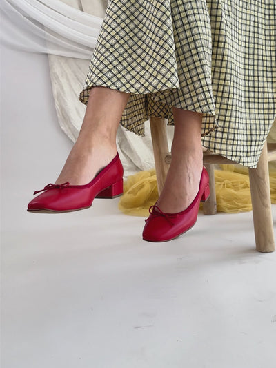 Bailarinas de mujer con un tacón de 3 cm perfectos para usar en el día a día o en eventos más formales. Están hechas en piel de la mayor calidad y tienen un lazo en el empeine. El piso está fabricado en material sintético antideslizante y cuenta con un diseño especial de miMaO para garantizar la estabilidad. Cuenta con una tachuela, en el lateral exterior del zapato.