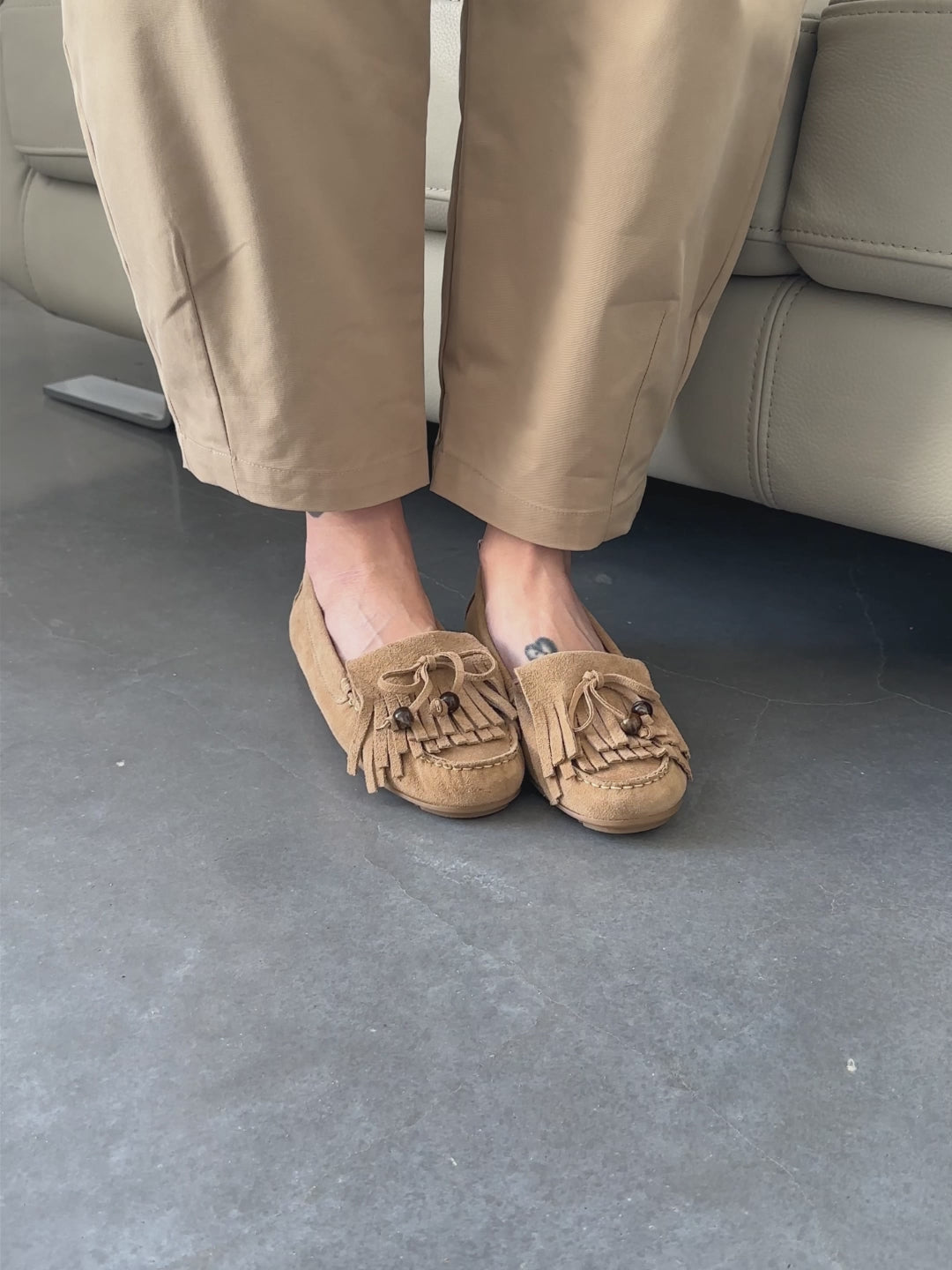 Este nuevo modelo de mocasines planos de ante con flecos y borlas incorpora una plantilla extraíble termo-conformada de espuma. Este par de mocasines se inspira de la moda étnica, fabricados a mano por nuestros artesanos, se adapta a todas tus opciones de look.
