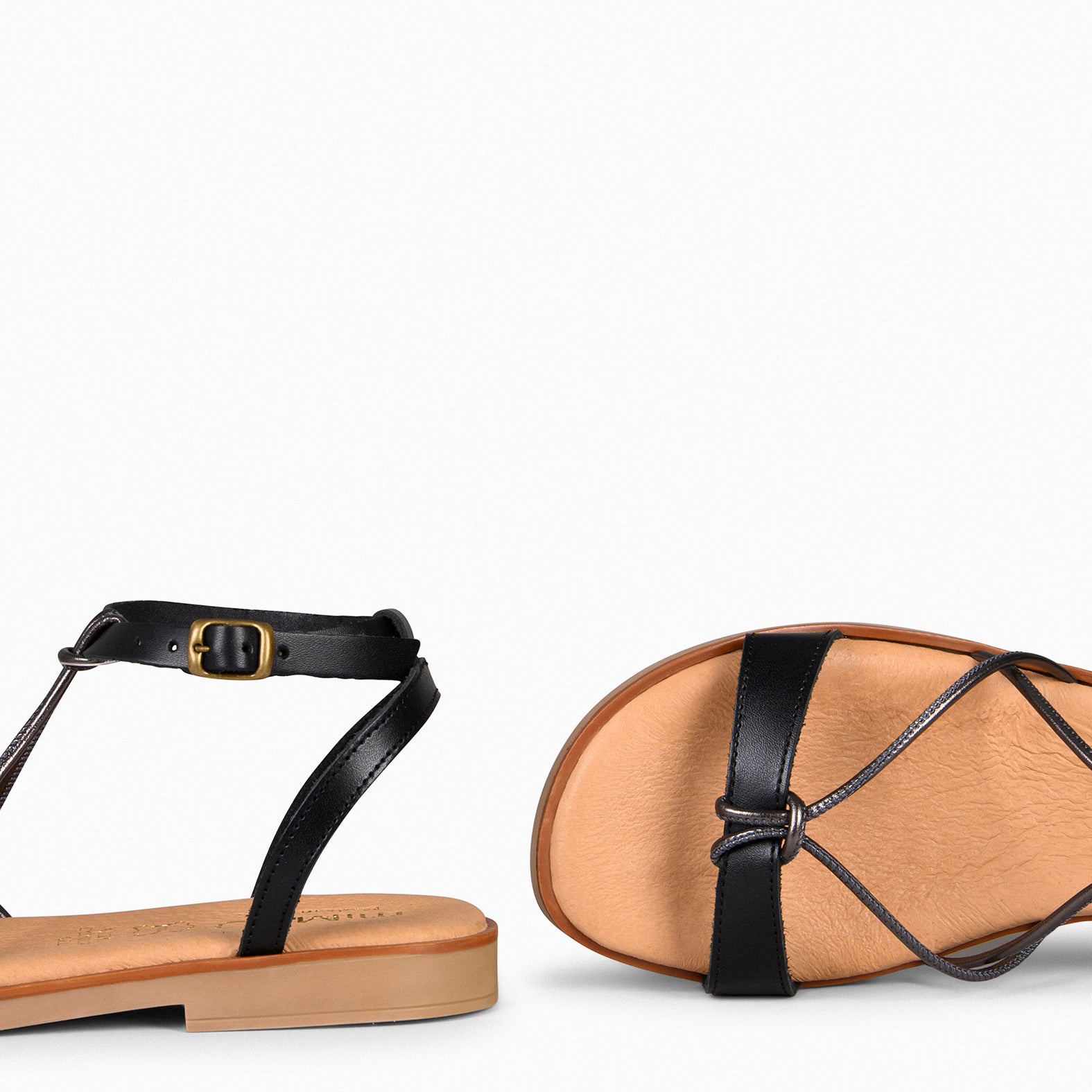 Ces sandales plates bi matières pour femme ont été imaginées avec un duo de matières ! La lanière sur le devant du pied ainsi que celle arrière sont en cuir de vachette et les cordons unissant ces lanières sont de couleur métallisé. Ce design original offre à ce modèle de sandales plates un style unique !