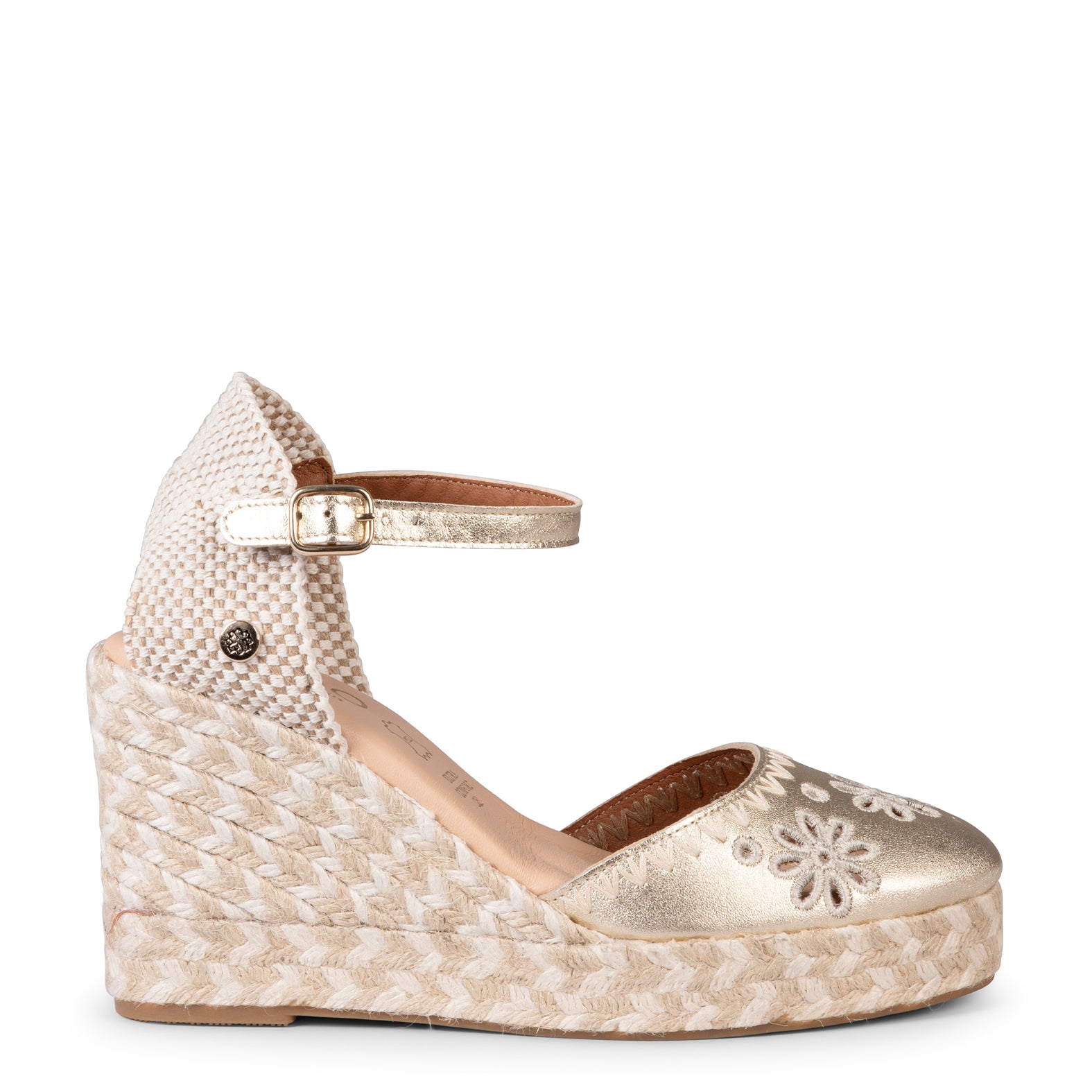 Ce modèle d’espadrilles à talon compensé de style bohème en cuir brodé est la paire qui sublimera tous vos looks en ce printemps été. Cette broderie de type anglaise ajoute une touche d'élégance et de raffinement à cette paire d'espadrilles pour femme. Et sa bride en cuir à boucle dorée offre plusieurs positions d’ajustement à la cheville.