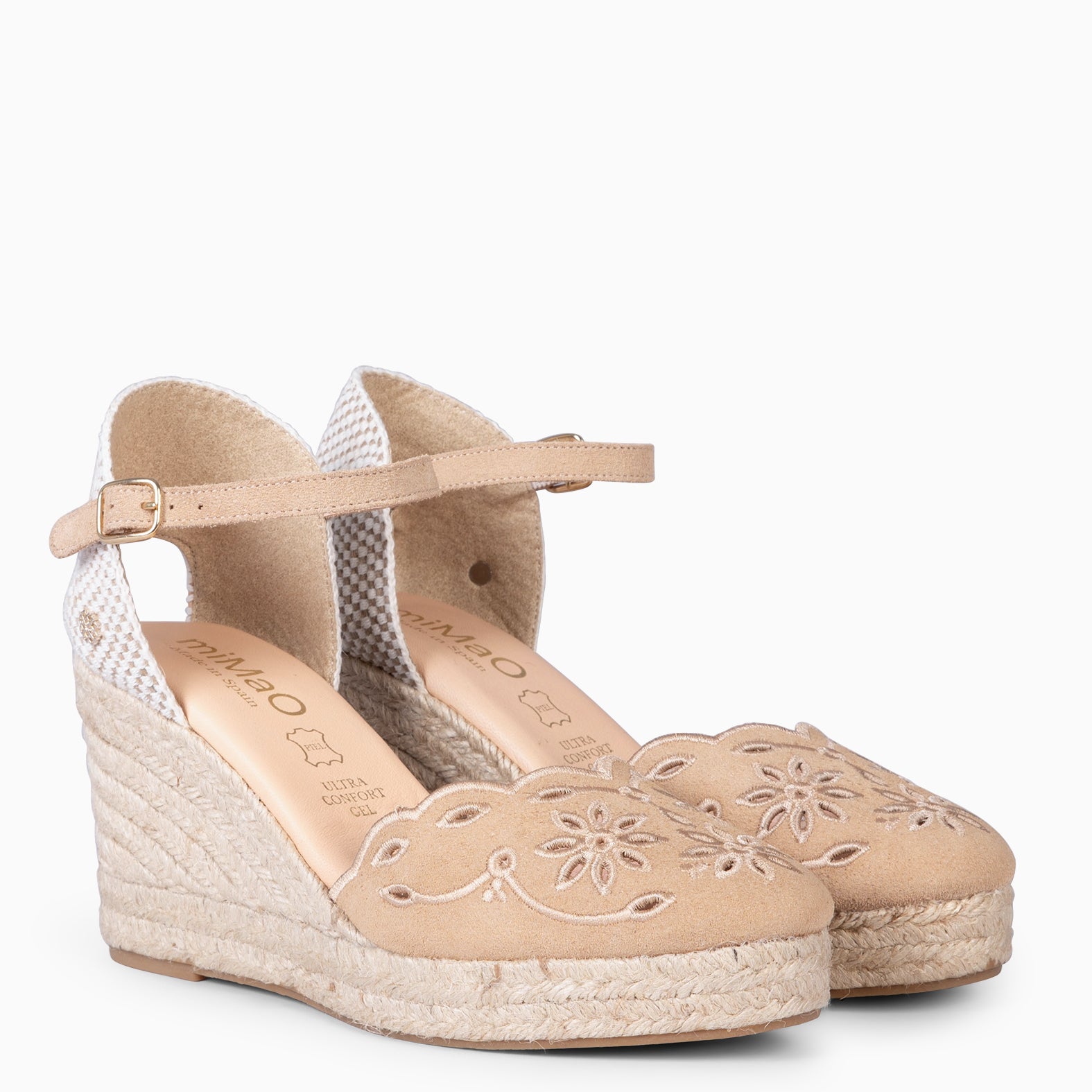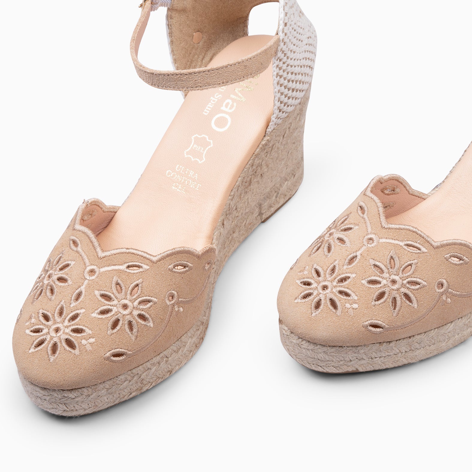 Ce nouveau modèle d’espadrilles à talon compensé de style bohème en daim brodé est la paire qui sublimera tous vos looks en ce printemps été. Cette broderie de type anglaise ajoute une touche d'élégance et de raffinement à cette paire d'espadrilles pour femme. Et sa bride en daim à boucle dorée offre plusieurs positions d’ajustement à la cheville.