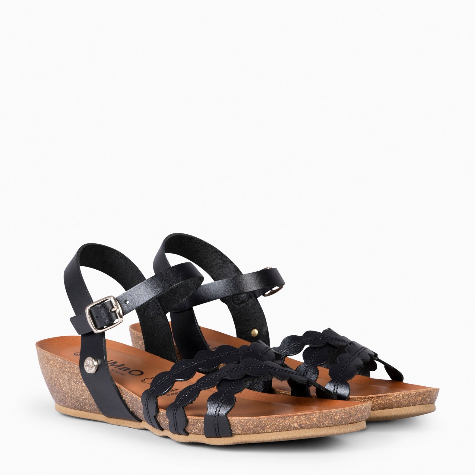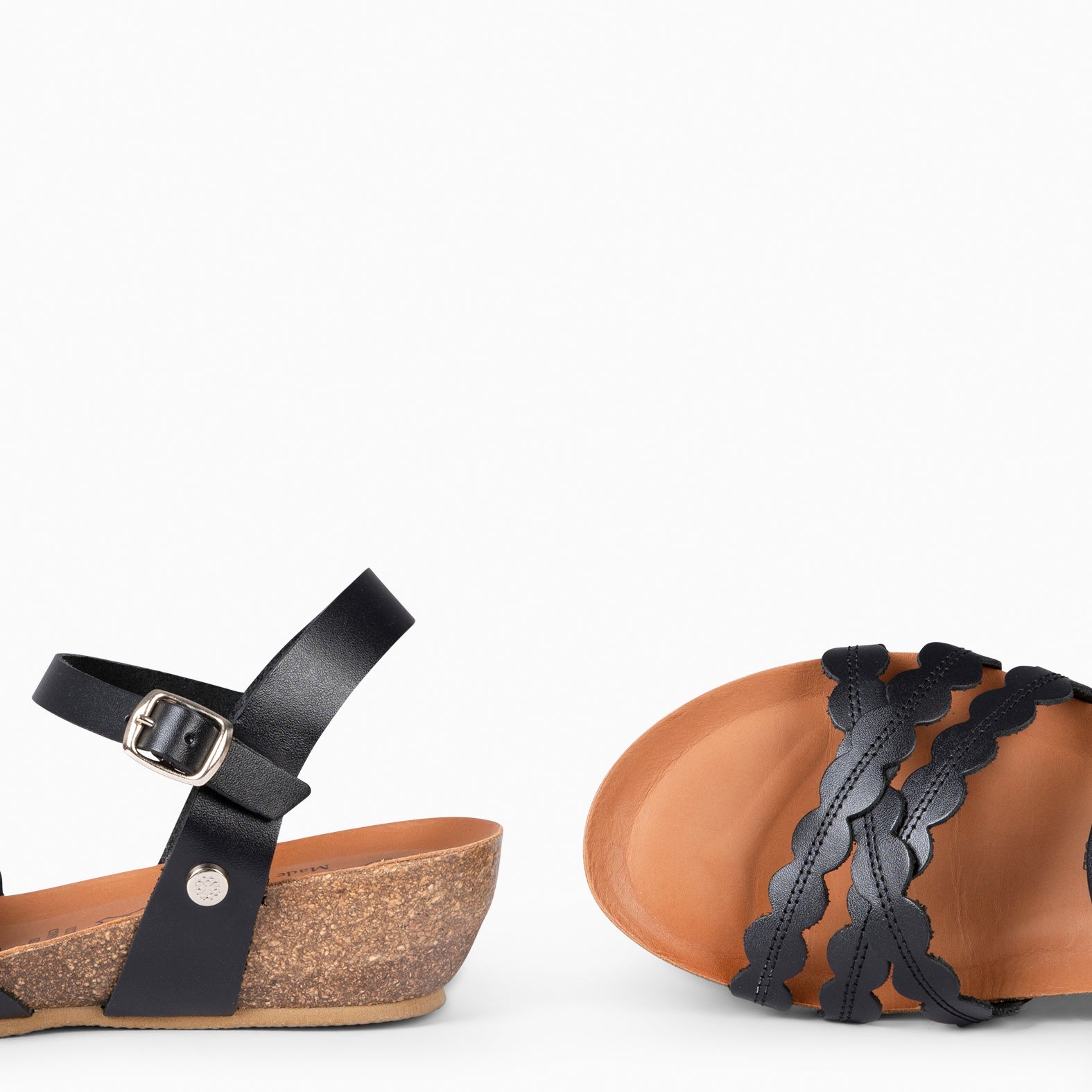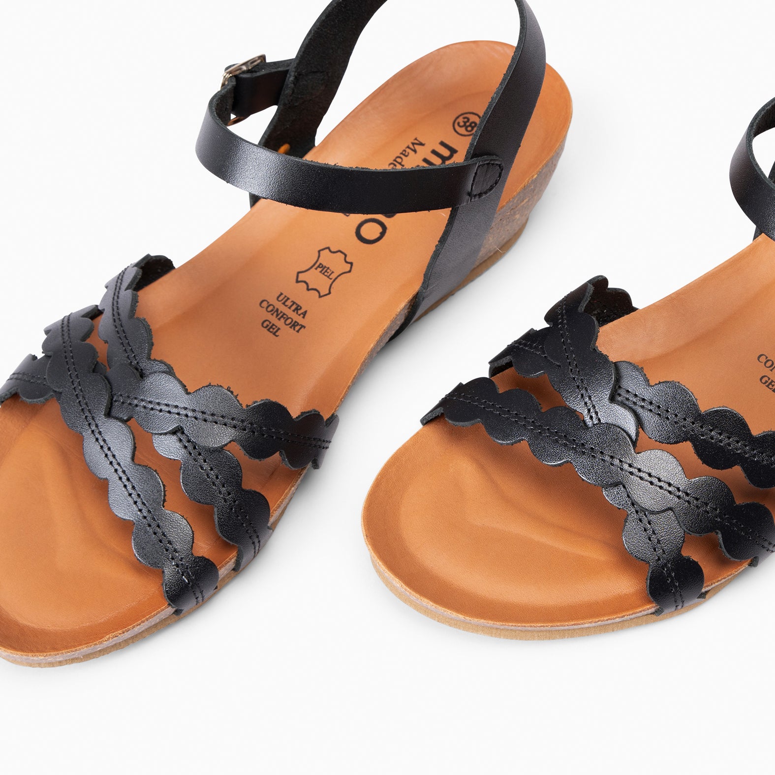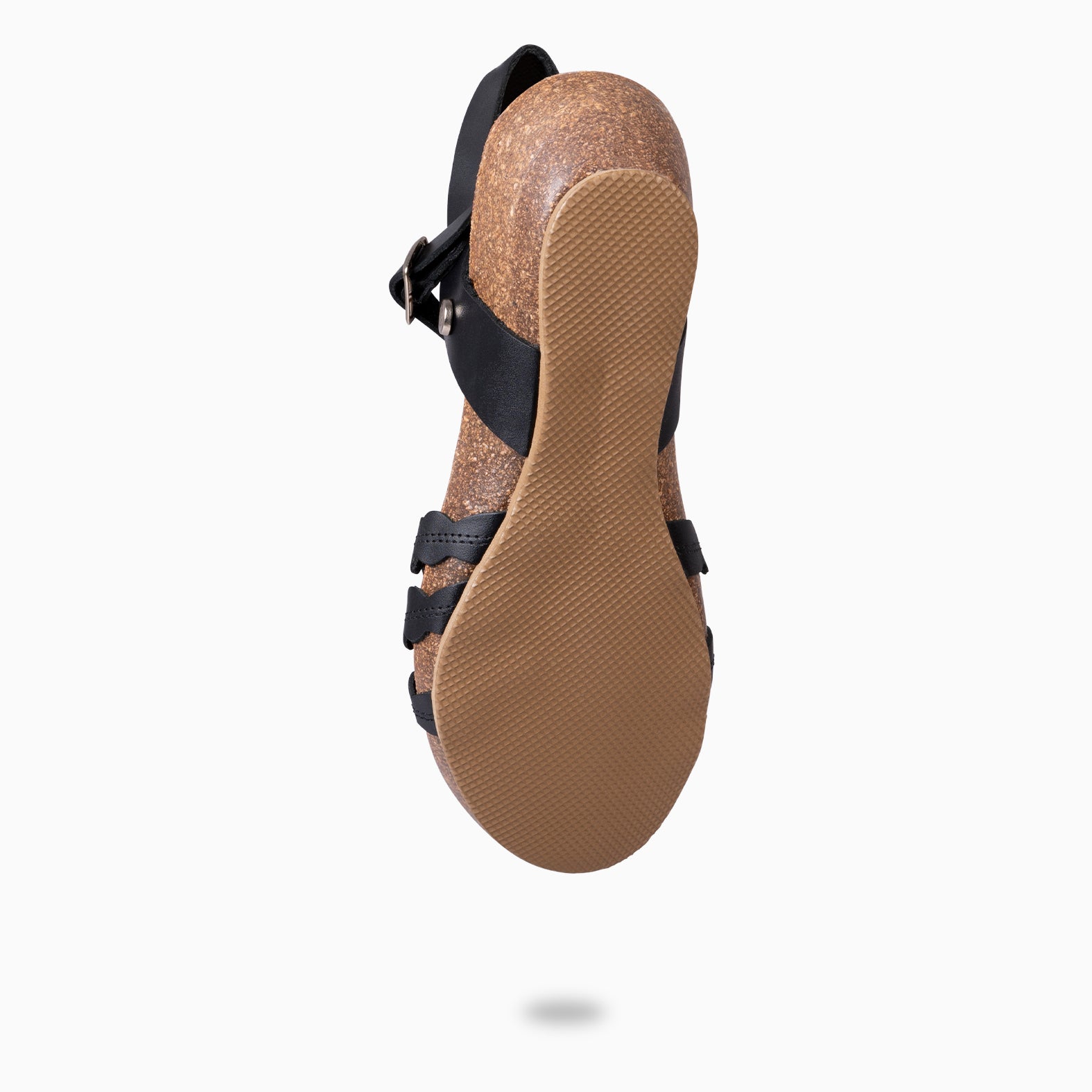 Ce nouveau modèle de sandales à talon compensé en liège est fabriqué de manière artisanale avec un trio de lanières en cuir. Ces sandales pour femme sont parfaites pour les journées d'été les plus chaudes grâce à leur design ouvert qui permet au pied de respirer. Elles sont dotées d'une bride à boucle réglable pour les ajuster à la cheville évitant ainsi qu’elles ne glissent lors de la marche.