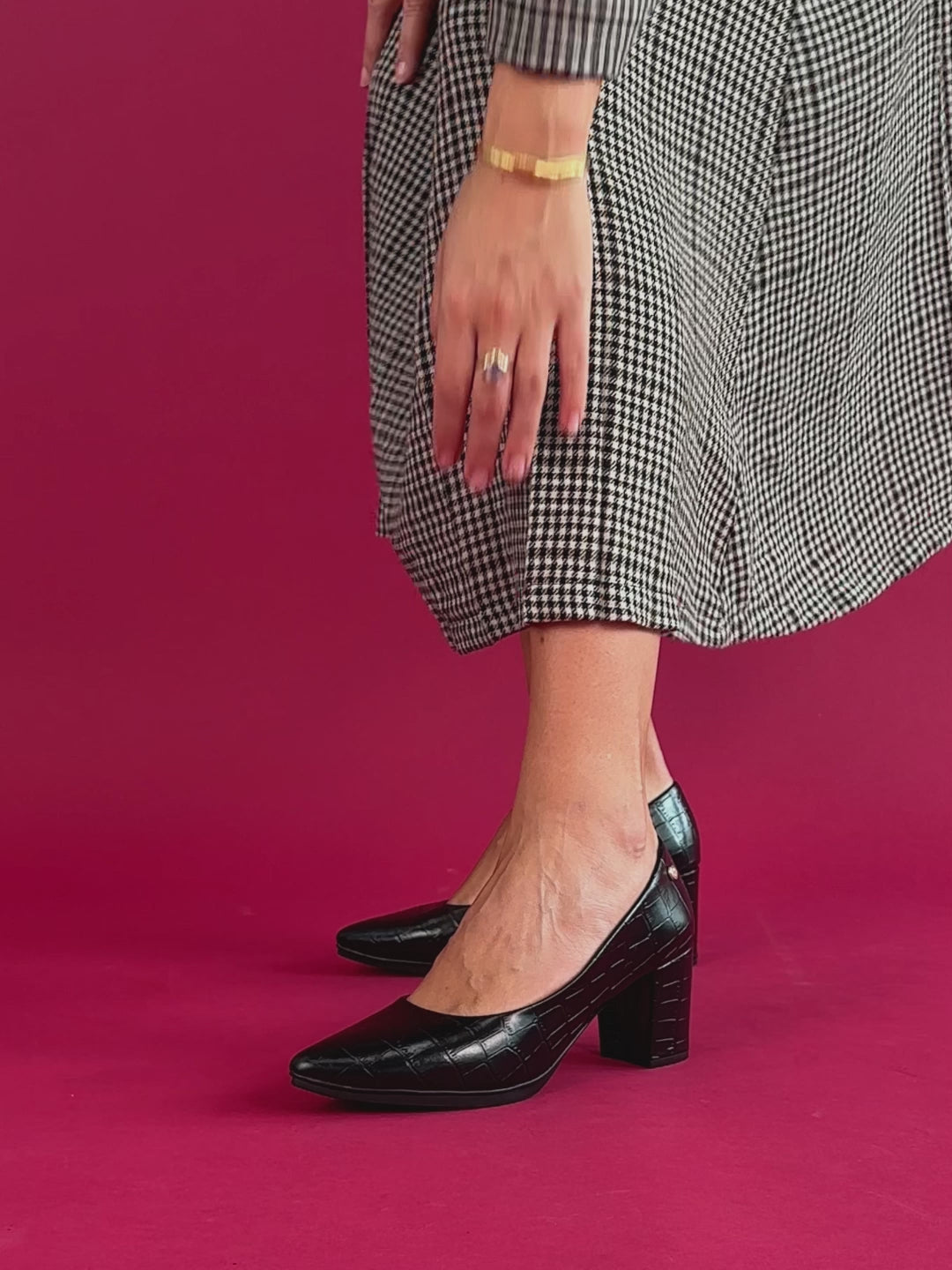 Découvrez nos escarpins pour femme en cuir texturisé serpent à bout pointu et à talon large de 6,5 cm. Ce modèle ultra tendance est fabriqué artisanalement dans nos ateliers, il saura sublimer tous vos looks et il est surtout ultra confortable !