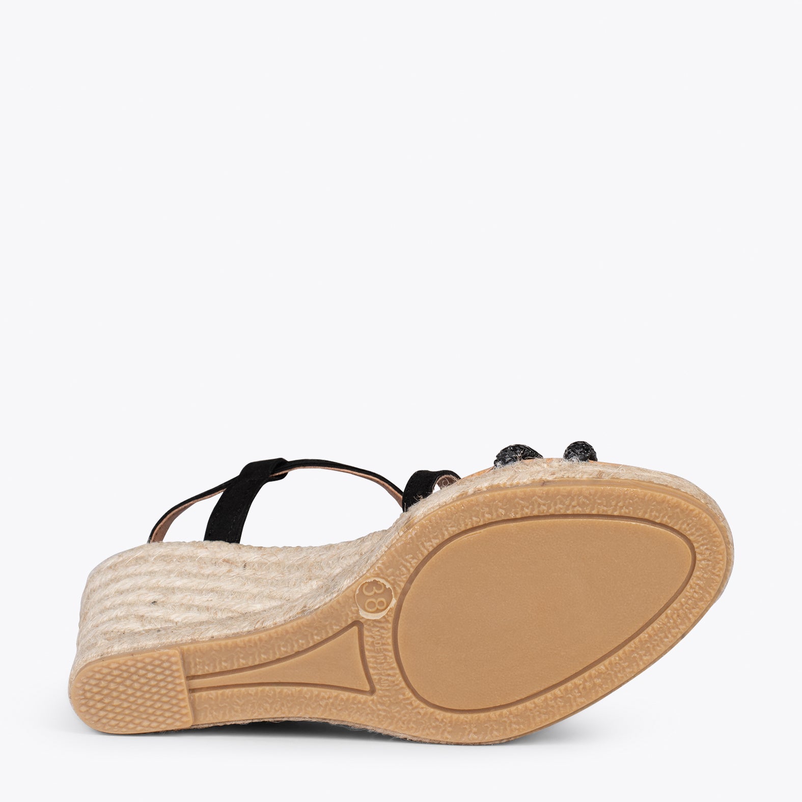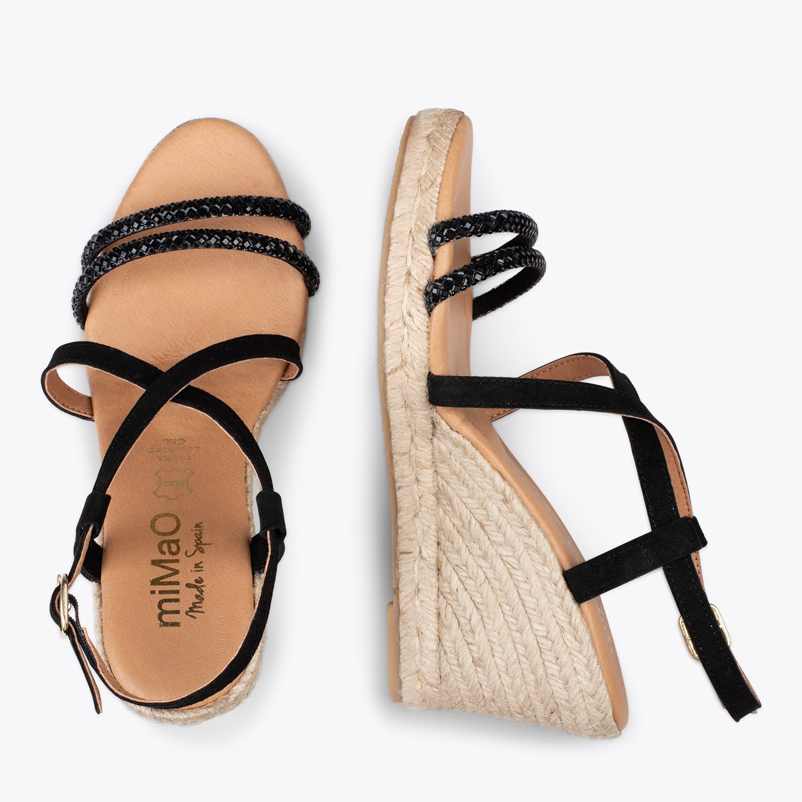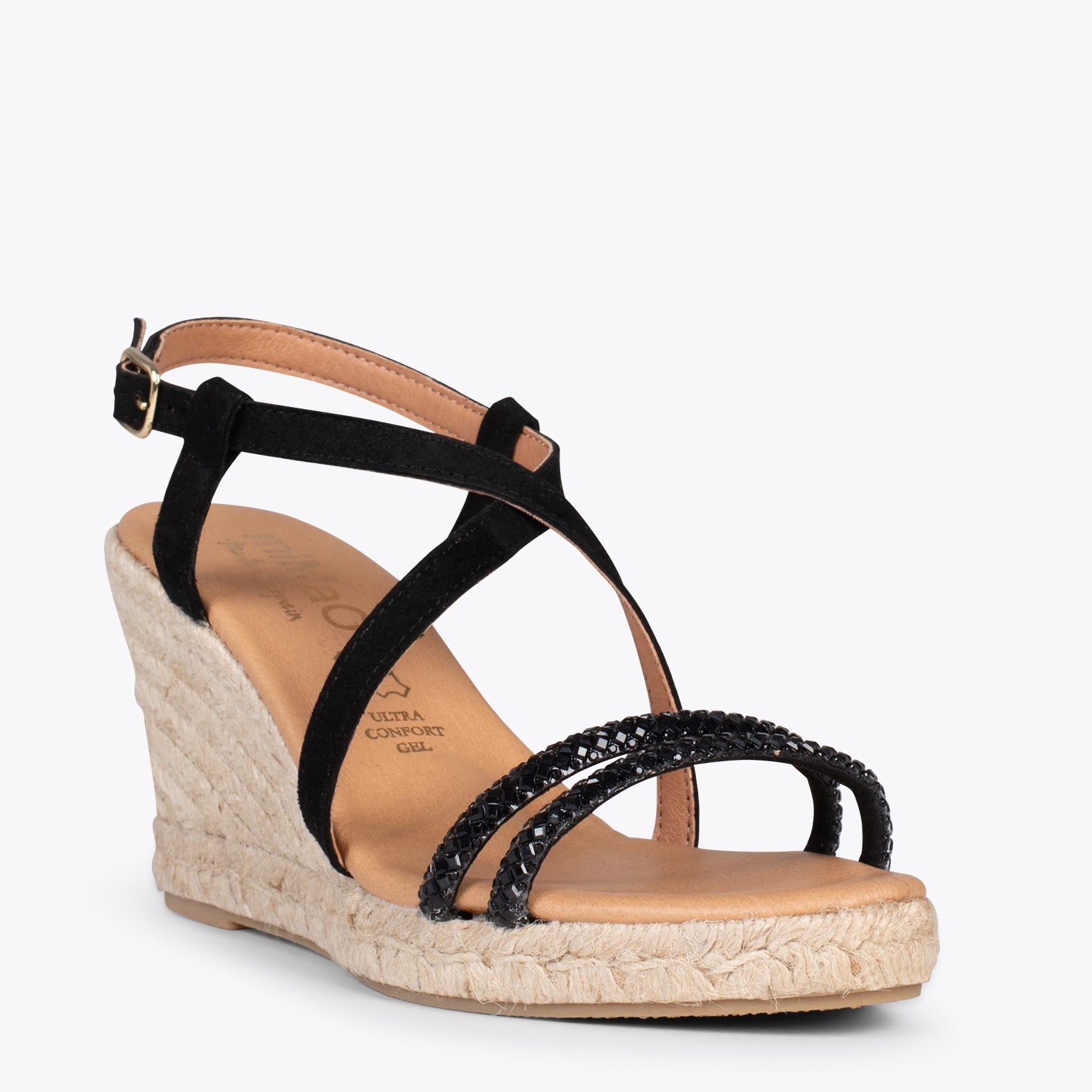 Cuña de plataforma hecha en material de yute en color negro. Esta cuña de esparto hecha de forma artesanal destaca por su comodidad gracias a su plantilla de piel, Ultra Confort Gel con Gota. Una plantilla tan cómoda que podrás estar con estas cuñas de yute horas.