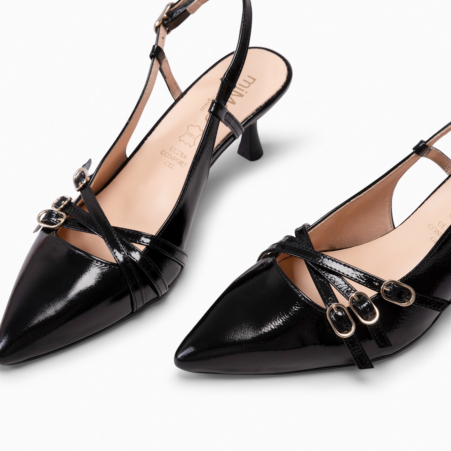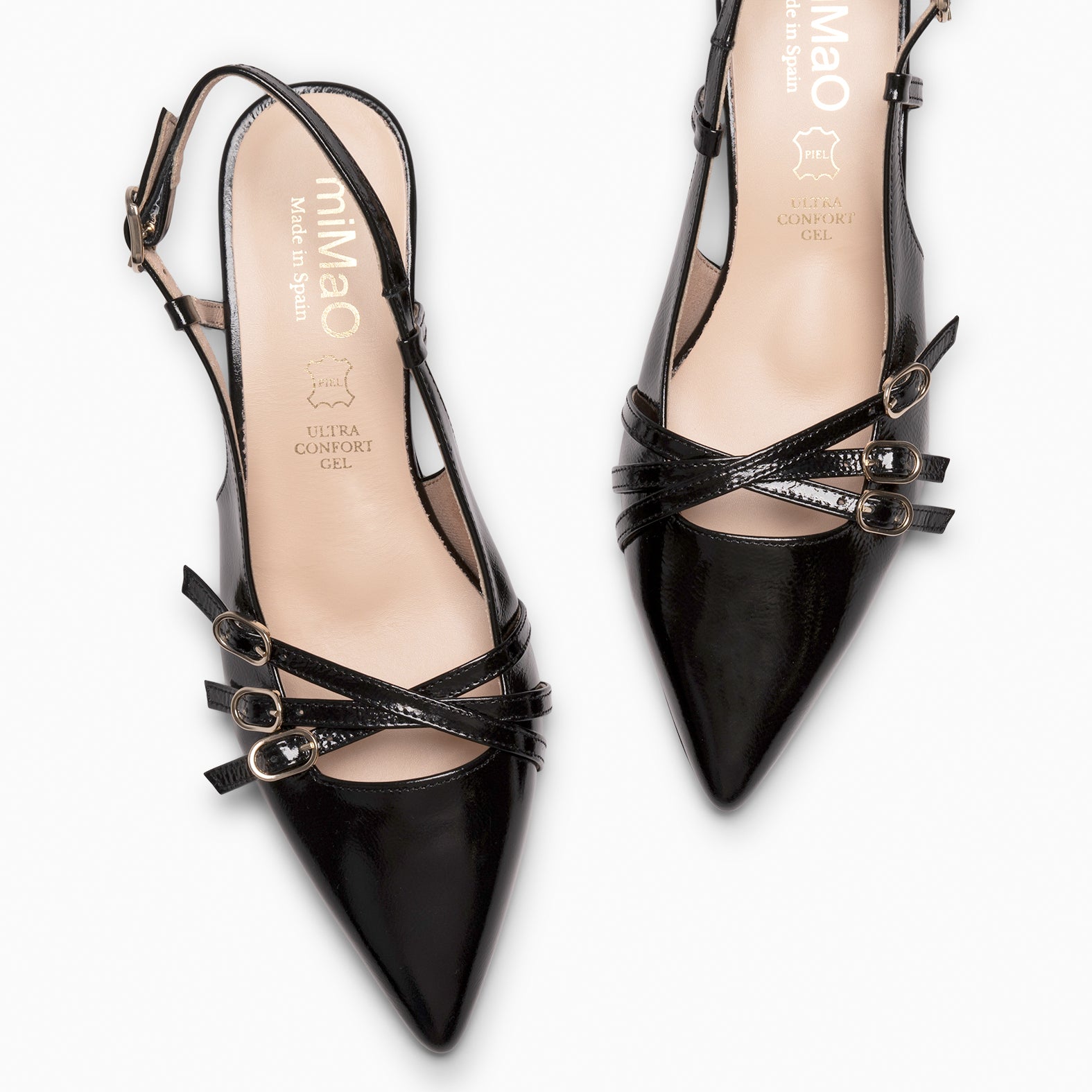 Los zapatos de tacón bajo destalonados tienen un tacón de 6 cm y están hechos en piel de charol. Presentan un elegante acabado en V, con hebillas decorativas en el empeine, y una hebilla trasera ajustable para un ajuste más cómodo y seguro.