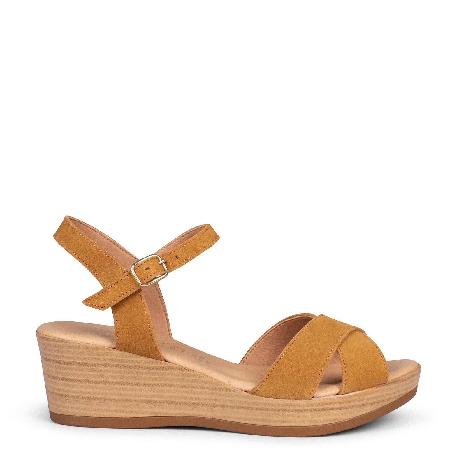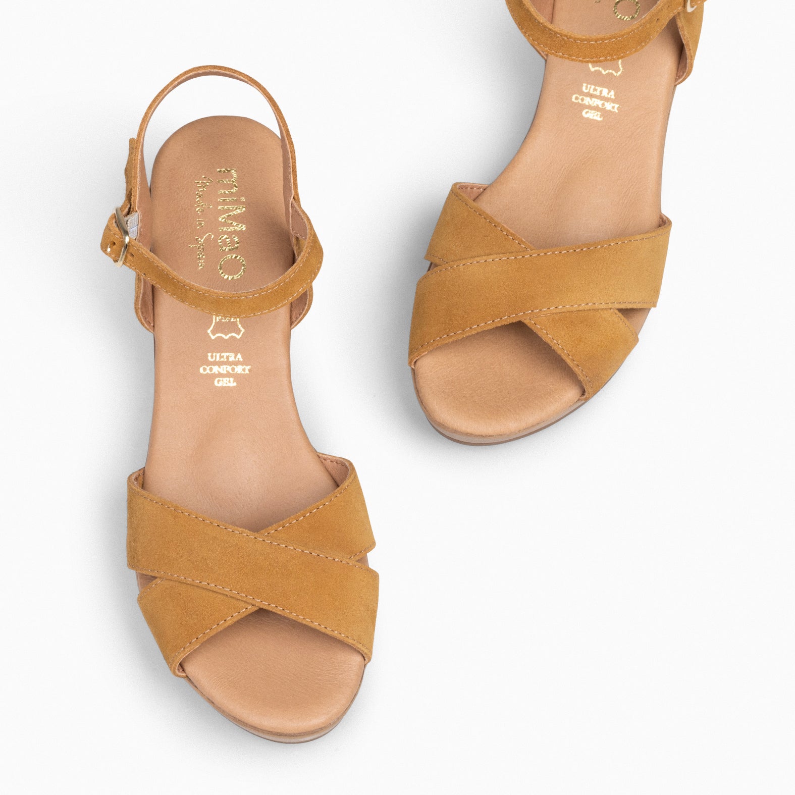 Estas cuñas ligeras con un estilo básico y una pala de tiras cruzadas fabricadas en piel de serraje. Su pulsera con hebilla permite ajustarlas al tobillo y mantener fijo el zapato al caminar.