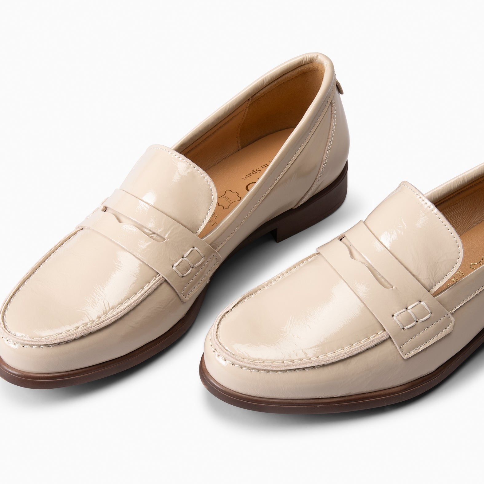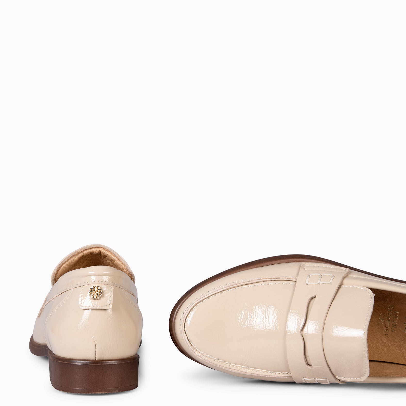 Este elegante mocasín es una novedad para la temporada primavera-verano. Elaborado en piel de charol, incorpora un pequeño tacón en la suela para mayor confort y un apoyo más natural. Su detalle decorativo en el empeine le añade un toque único y distintivo.