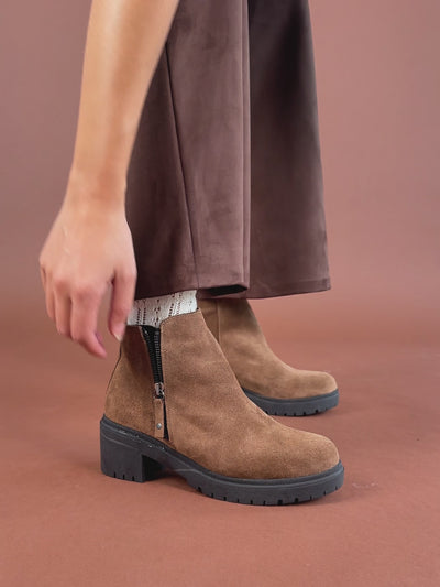 Botines de tacón y plataforma para mujer de Otoño Invierno. Estos botines están fabricados en piel de serraje con tratamiento hidrófugo, repele el agua. Tiene una altura de 6 cm de tacón y una altura de piso de 2 cm.