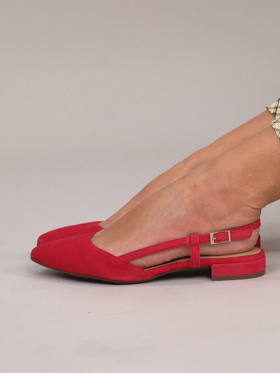 Zapatos destalonados de mujer de nueva Colección Primavera Verano. Unos zapatos Rojos de tacón bajo fabricados en piel de ante de gran calidad. Los zapatos destalonados son tendencia cada temporada, es un estilo de salón que combinará perfectamente con los outfits de mujer en Primavera.
