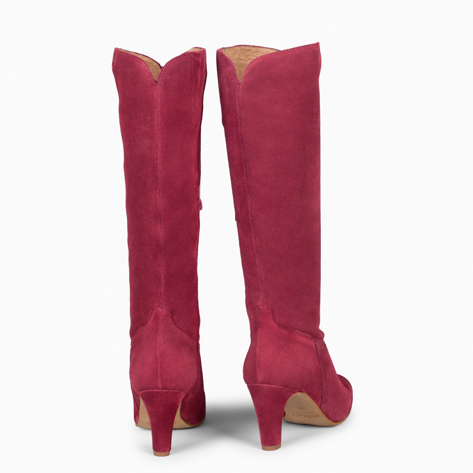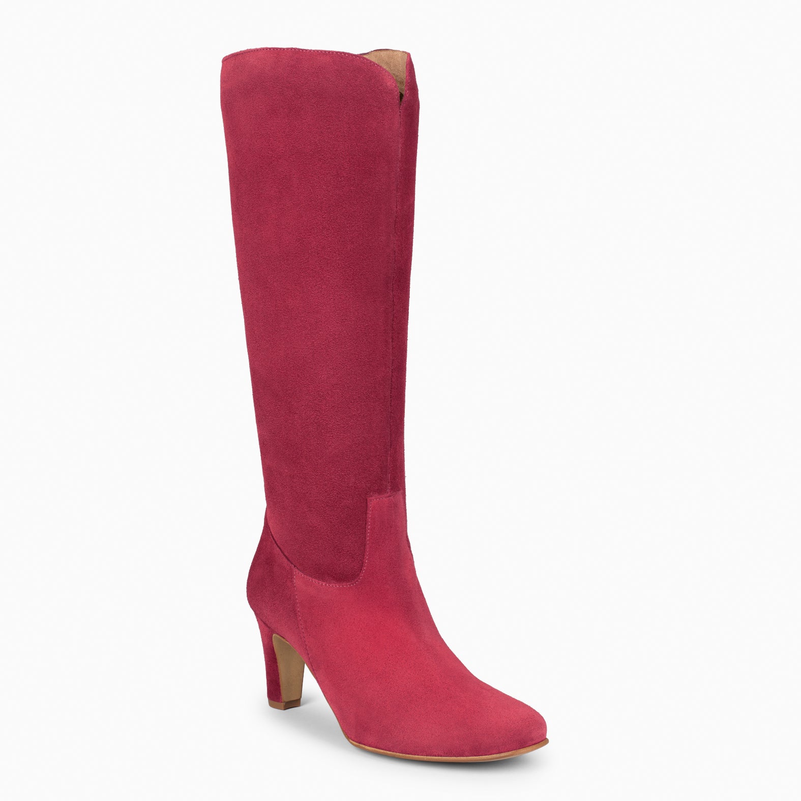 Botas de caña alta con tacón ideales para abrigarse en los días más fríos de la temporada Otoño Invierno 2023 2024. Están fabricadas en piel de serraje de gran calidad con un acabado en color Cereza que permite combinarlas con prácticamente cualquier tipo de estilo.