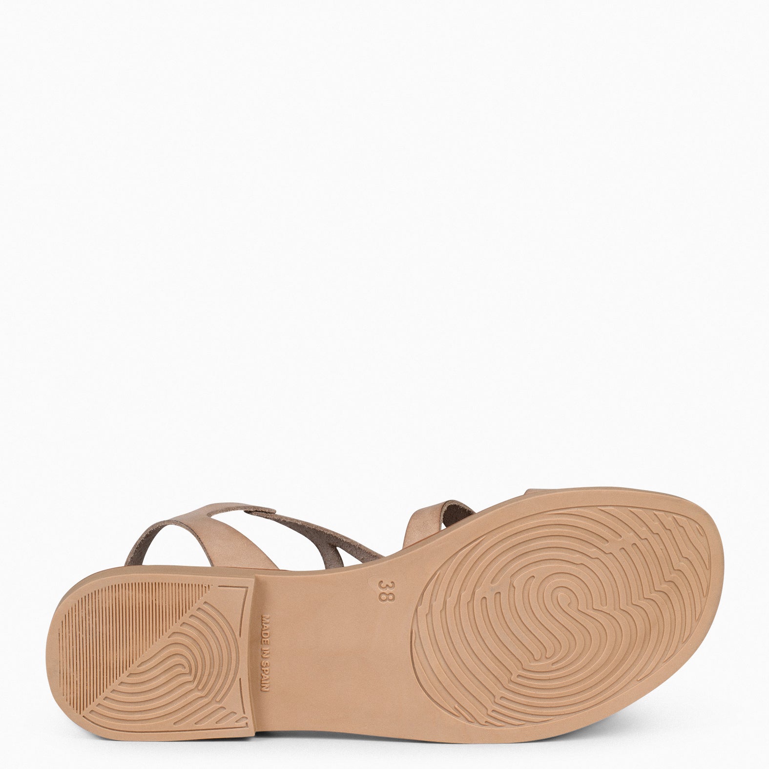 Sandalias planas de mujer color XXX muy flexibles, para una pisada perfecta. Están hechas en piel de vaquetilla, siendo muy cómodas. La pala está formada por un par de tiras, formando una sola estructura, uniéndose a la tira trasera. En donde se encuentra una hebilla, idónea para una perfecta sujeción del pie. El conjunto de tiras ofrece un precioso dibujo sobre el empeine del pie.