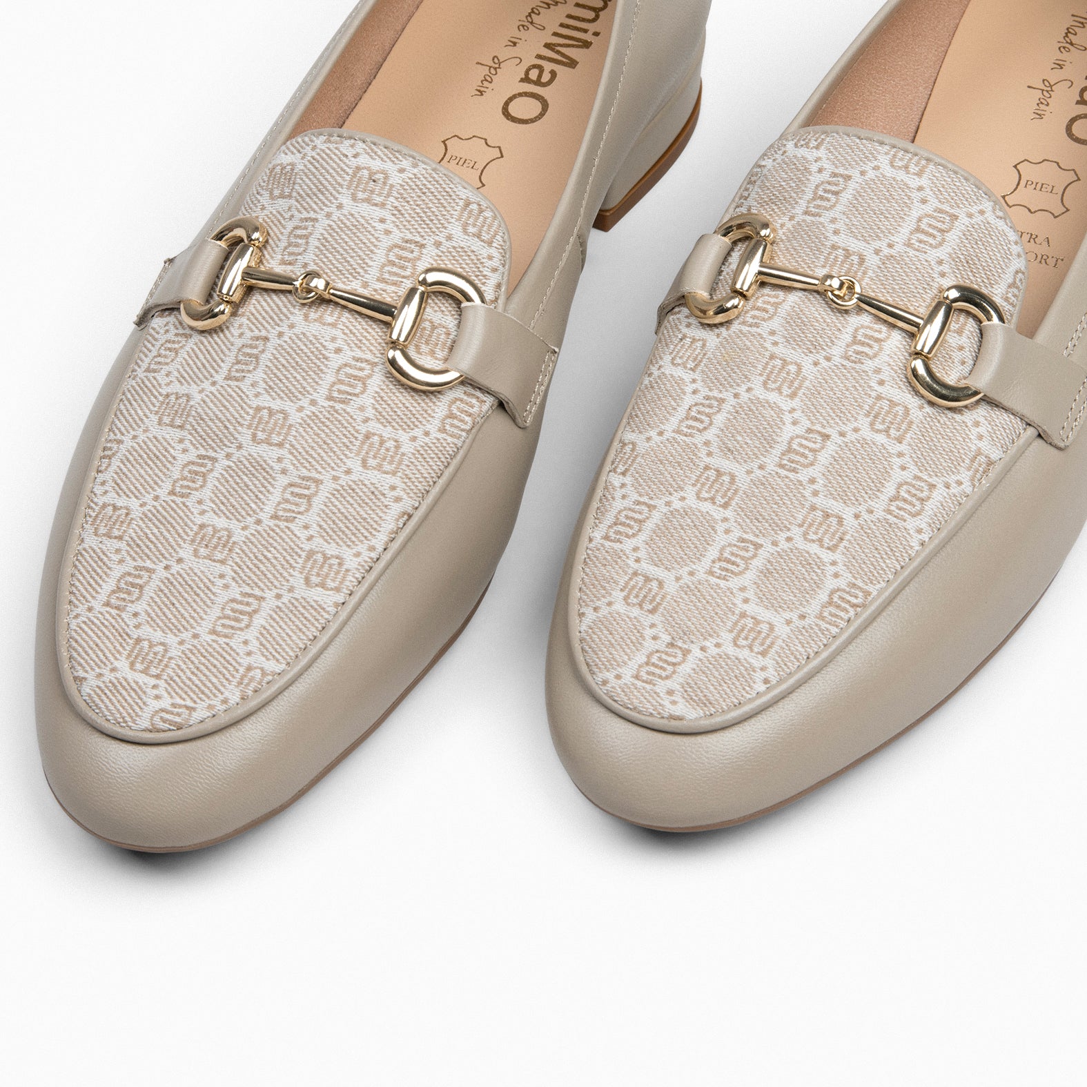 Sumérgete en la sofisticación y comodidad con nuestro mocasín exclusivo para mujer en color taupe. Fabricado con exquisita piel de napa, este mocasín destaca por su calidad y elegancia. La pala, adornada con un tejido jacquard de dibujos geométricos y un aplique de boca de caballo, añade un toque distintivo y contemporáneo a este calzado atemporal.