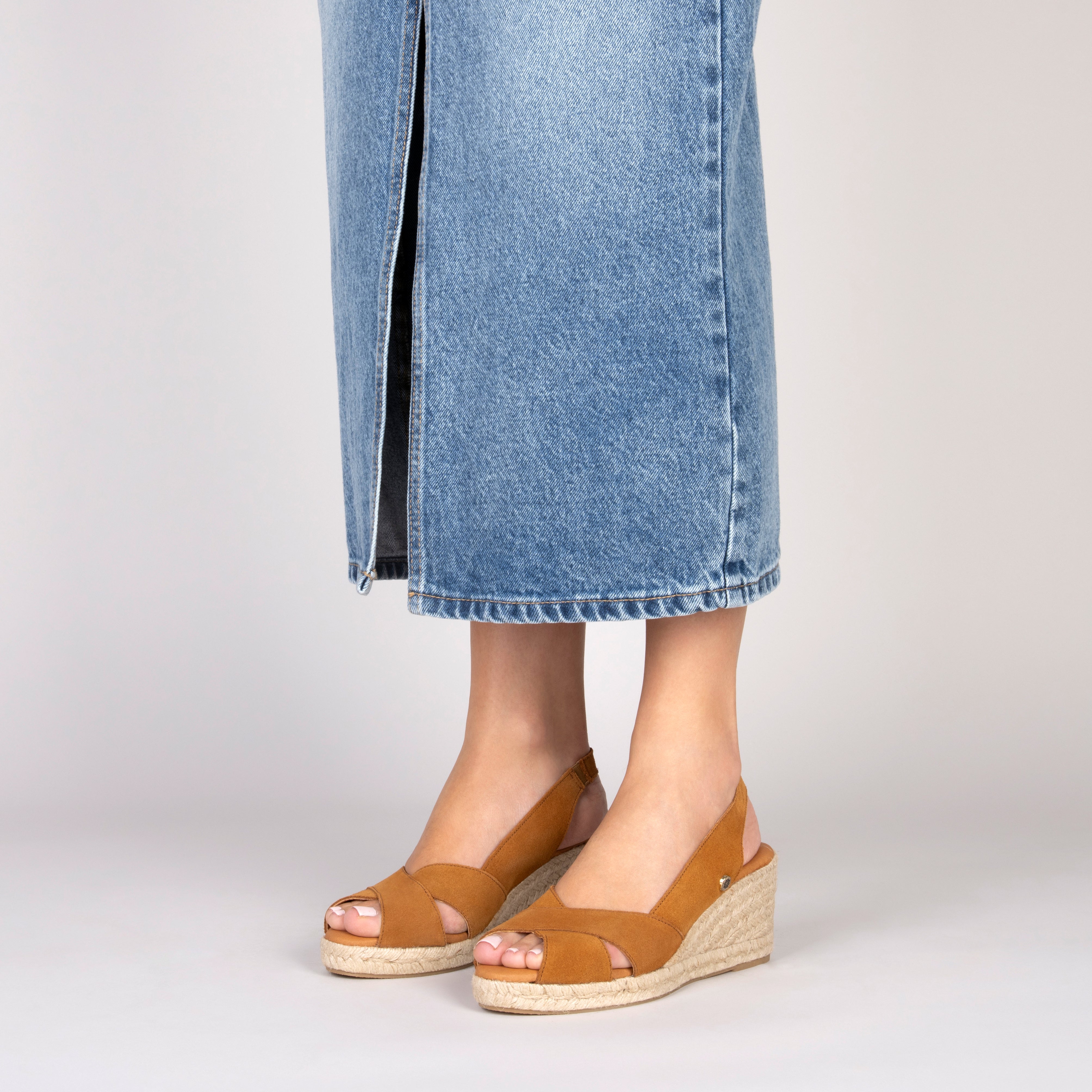 Estas cunhas de esparto são feitas couro de camurça, sendo a biqueira circular uma caraterística distintiva do design peep toe. Com uma cunha de 7,5 cm e uma plataforma de 2 cm, estas sandálias esparto oferecem uma altura ideal que emagrece a sua figura, permitindo-lhe desfrutar do conforto de uma sola estável em cada passo.